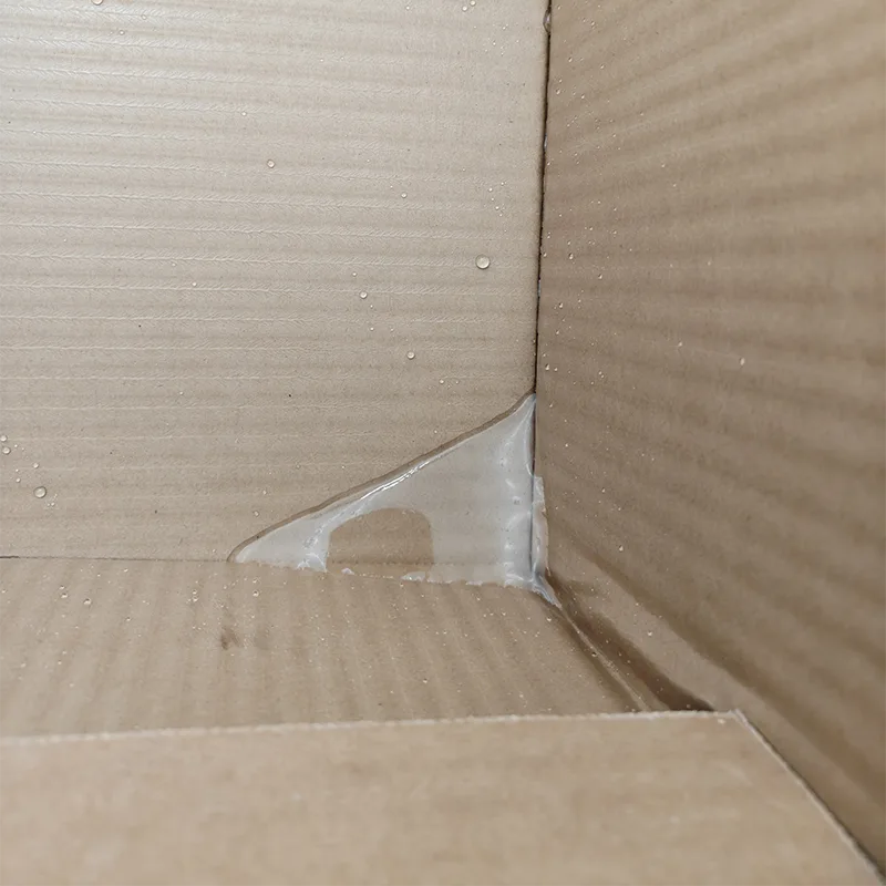 ● For scenarier som kjøkkenlagring, transport på regnværsdager og ferskvareomsetning som kan støte på vann, er utsiden av esken fullstendig dekket med matkvalitets gjennomsiktig voksfilm. Utilsiktet søl av soyasaus eller vann kan enkelt tørkes av med en klut, og voksfilmen vil ikke flasse av eller tillate fuktighet å trenge inn i papirlagene, noe som får boksen til å mykne. Selv ved kortvarige lett regnsprut vil det ikke være vannmerker, og boksens hardhet forblir uendret.